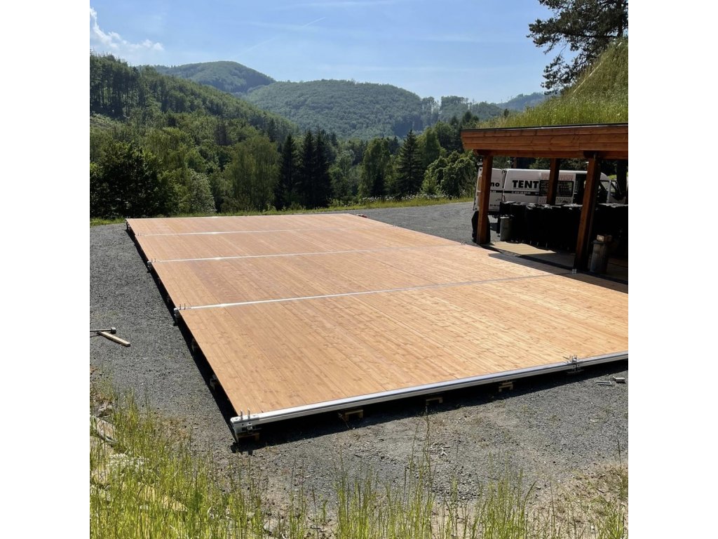 Drevené lakované podlahy na oceľovom priehradovom rošte zvyšujú celkovú úroveň vnútorného priestoru mobilného zastrešenia. V párty stane s podlahou sa Vám nikdy nebude prášiť. Dámy v podpätkoch sa neboria do rozmäknutého povrchu. Masívny oceľový rošt vyrovná aj značné terénne nerovnosti a garantuje maximálnu rovinu a pevnosť. Podlaha Vám môže zároveň poslúžiť ako reprezentatívny tanečný parket. Žiadny ďalší špeciálny povrch pre tanec nepotrebujete. Stan stojí vždy na podlahe 13 cm nad absolútne rovným povrchom. Nejedná sa teda o podlahu vloženú tak, ako pri lacných systémoch.