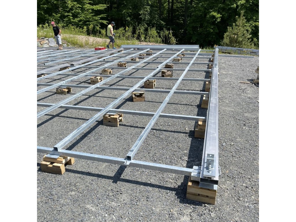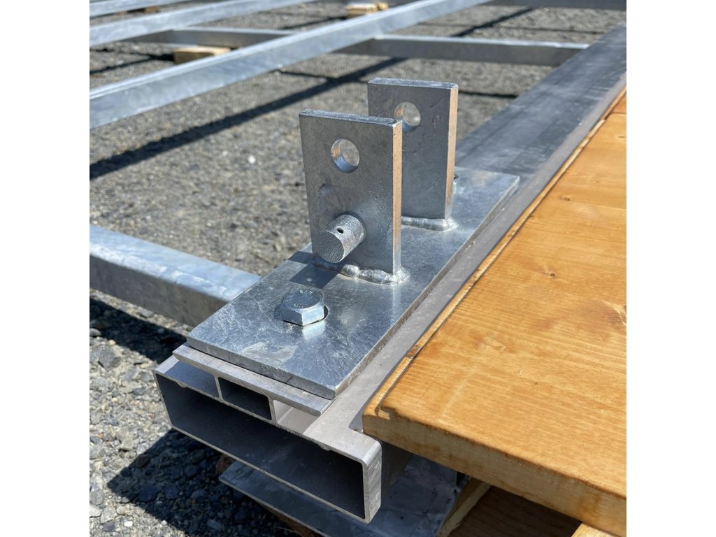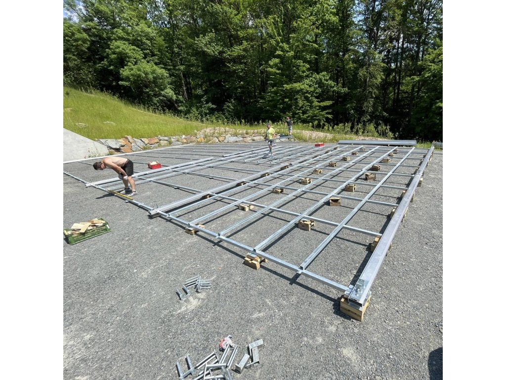 • vyvinuli sme špeciálnu oceľovú vidlicu so 4 trnmi, ktorá nám prepája vrchnú hliníkovú šínu so spodným oceľovým roštom. Týmto spôsobom garantujeme, že je podlaha so stanom prepojená fakticky, nie zdanlivo. Stan Vám z našej podlahy nikdy neuletí. Pre Vašu predstavu: váha stanu 10x20 m s podlahou od nás je 4.050 kg. S takou váhou len tak niečo nepohne. Pokiaľ použijete stan s našou podlahou, nemusíte ho akokoľvek kotviť alebo zaťažovať. Túto výhodu oceníte v miestach, kde sa nedá kotviť, v situáciách, kde nie je priestor alebo podmienky na umiestnenie funkčných ťažkých záťaží/závaží.